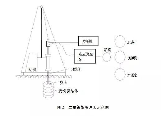 2二重管法:又稱漿液氣體噴射法,是用二重注漿管同時將高壓水泥漿和空氣兩種介質噴射流橫向噴射出,沖擊破壞土體。在高壓漿液和它外圈環繞氣流的共同作用下,破壞土體的能量顯著增大,最后在土中形成較大的固結體。